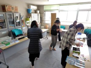 職員室前に設置されているベルマーク回収箱「しおまるボックス」に、皆さんが集めてくださったベルマークを回収し、仕分け作業を行いました。
