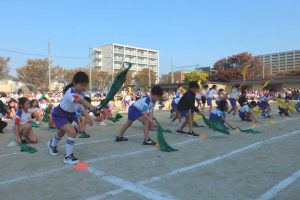 ボンボンを手に持って、順番に立ったり座ったり、明るく元気に踊りました!円形への移動もスムーズに出来、1年生からの成長を感じる場面でした。