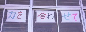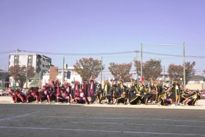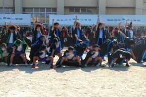 ハッピにハチマキ、大きな声で力強い踊りがとても凛々しく、低い姿勢が多い中、大きく体を動かして精一杯踊りました。ハッピの後ろには、各自で選んだ文字が書いてあり、カッコ良さが増していました。