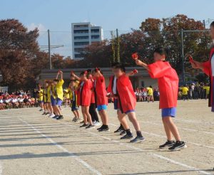 大きな太鼓の音と共に、三三七拍子。団長と共に、お腹の底からの応援合戦。赤組も白組も、どちらも「勝つぞ!」の意気込みを強く感じました。